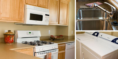 Kitchens include self-cleaning range, dishwashing, no-frost refrigerator, garbage disposal,